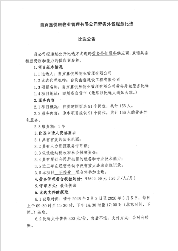 自贡嘉悦居物业管理有限公司劳务外包服务比选比选公告