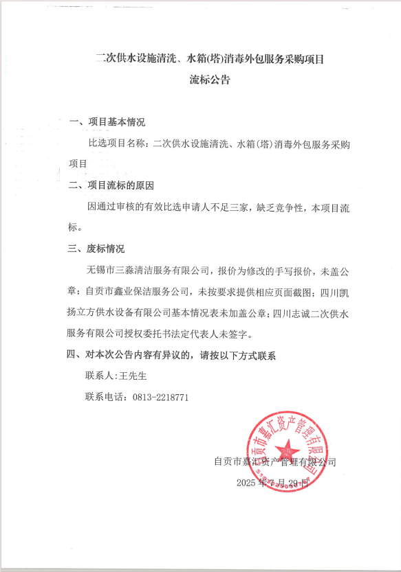 二次供水设施清洗、水箱(塔)消毒外包服务采购项目流标公告