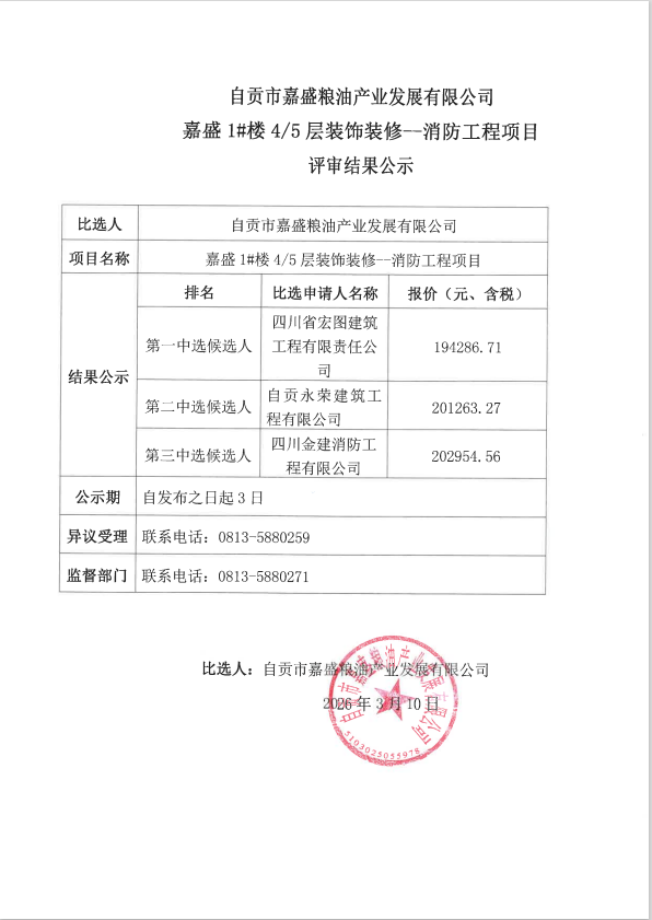 自贡市嘉盛粮油产业发展有限公司嘉盛1#楼4/5层装饰装修——消防工程项目评审结果公示
