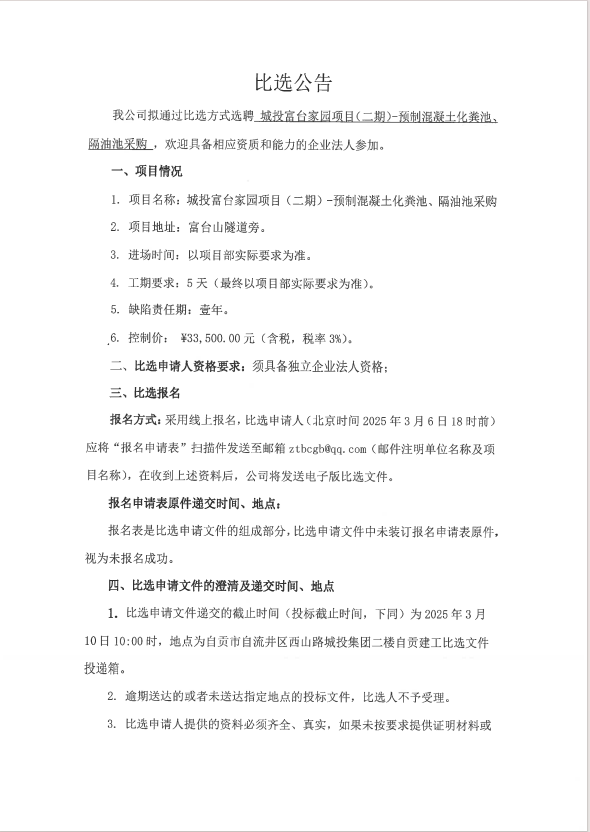 城投富台家园项目二期—预制混凝土化粪池、隔油池采购比选公告