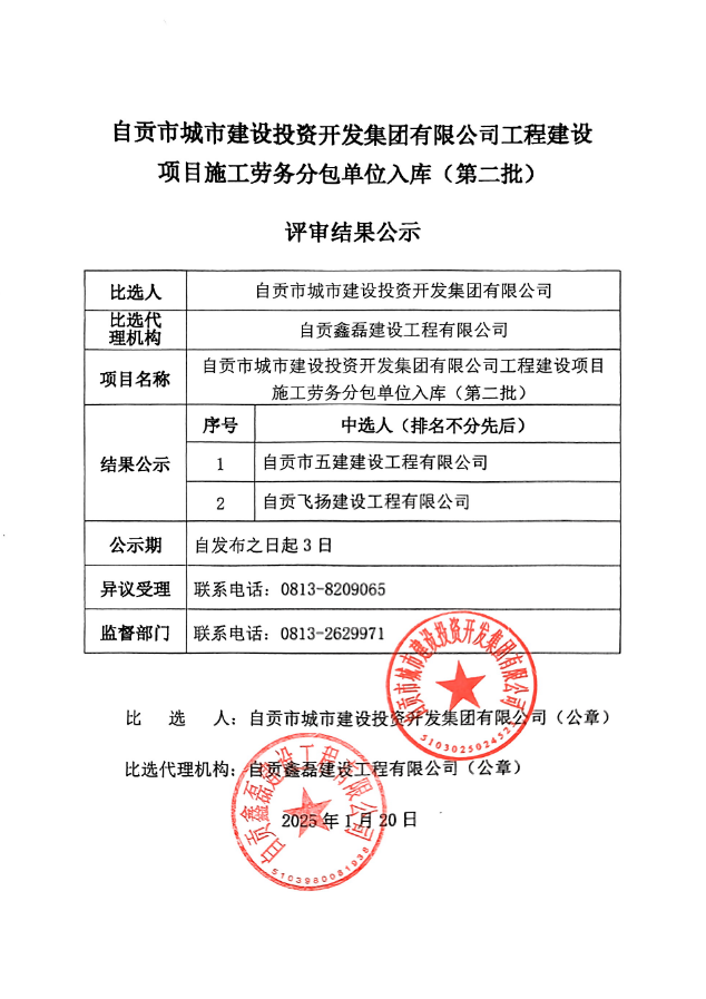 自贡市城市建设投资开发集团有限公司工程建设项目施工劳务分包单位入库(第二批)评审结果公示