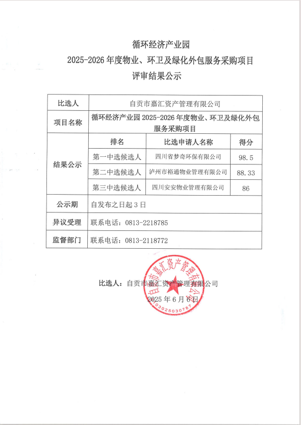 循环经济产业园2025-2026年度物业、环卫及绿化外包服务采购项目评审结果公示