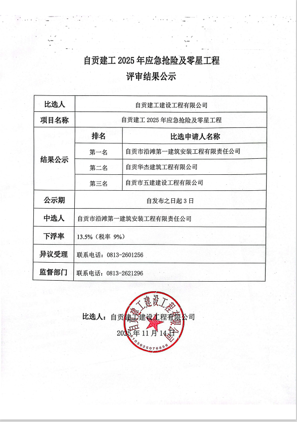 自贡建工2025年应急抢险及零星工程评审结果公示
