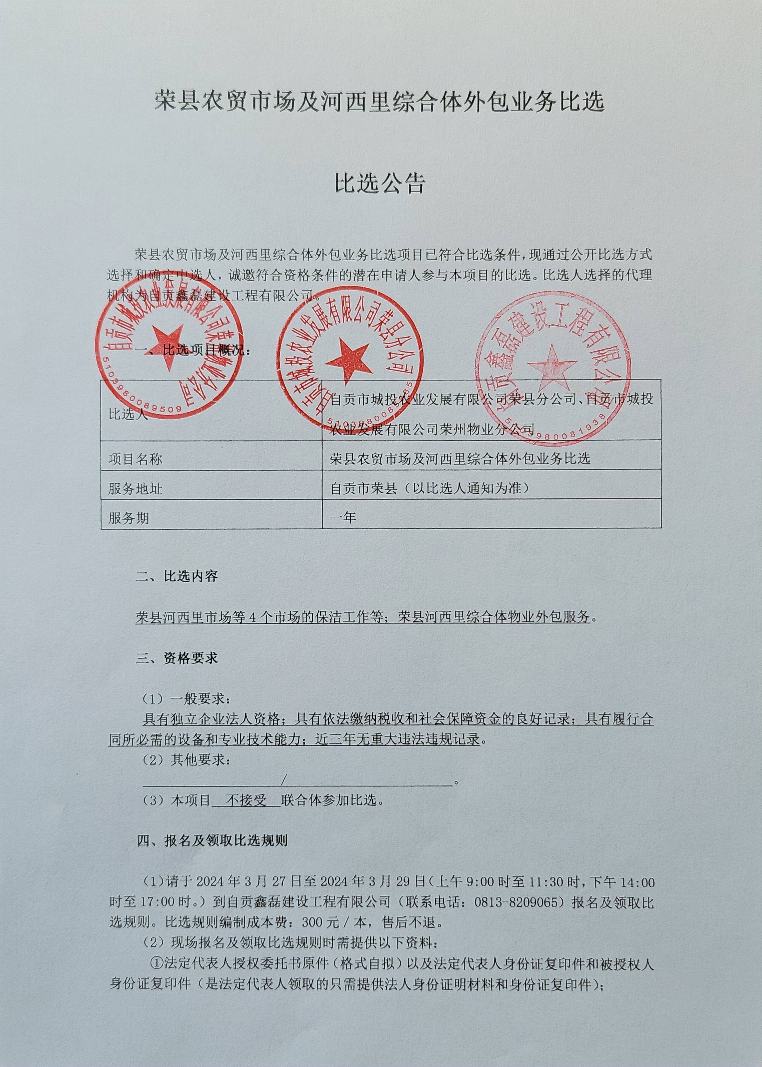 荣县农贸市场及河西里综合体外包业务比选公告