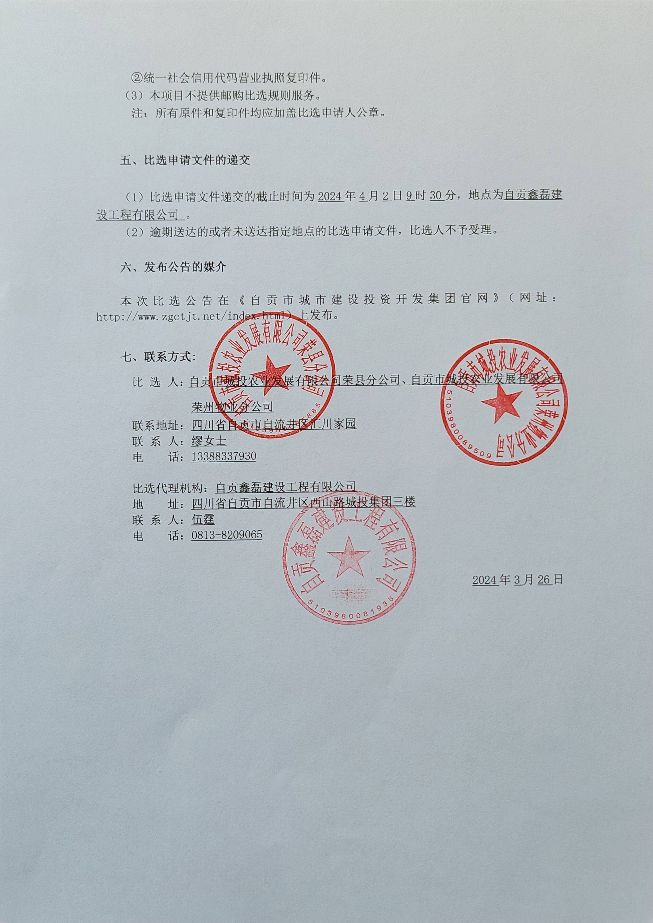 自贡市城投农业发展有限公司直管市场保洁清运工作承包服务比选中