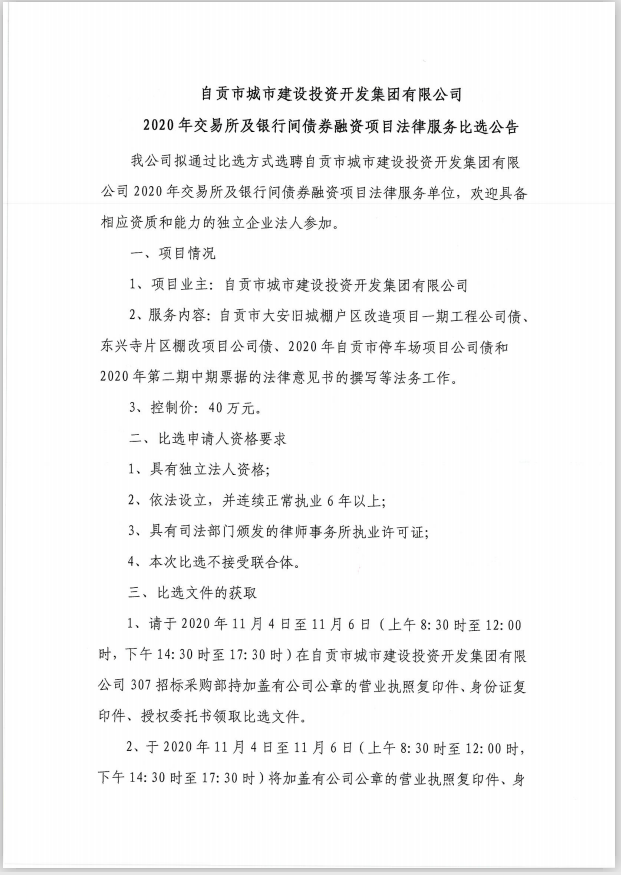 自贡市城市建设投资开发集团有限公司2020年交易所及银行间债券融资项目法律服务比选公告