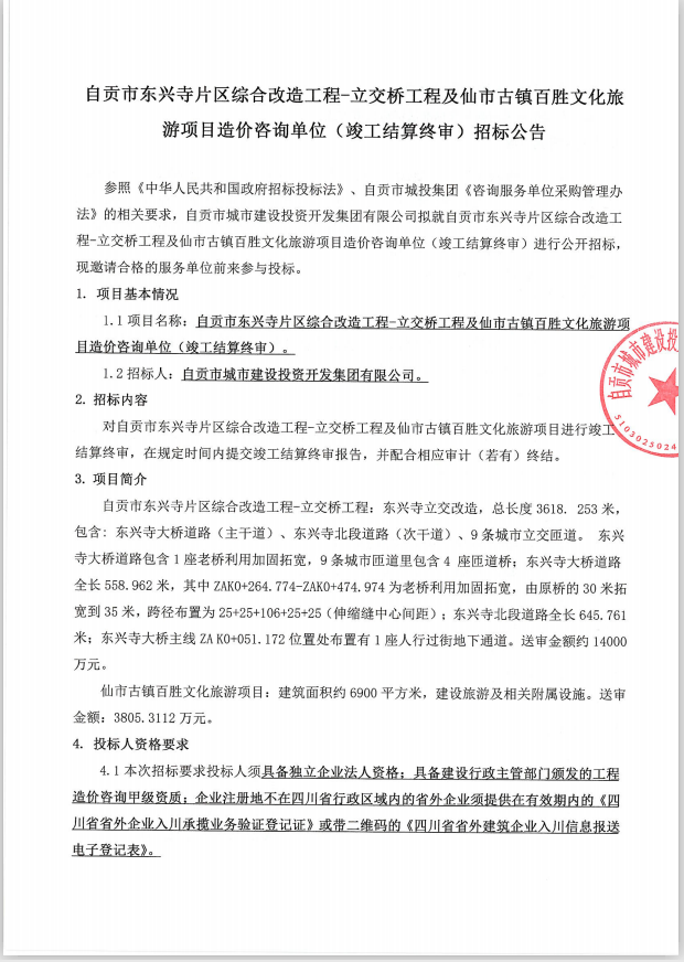 自贡市东兴寺片区综合改造工程-立交桥工程及仙市古镇百胜文化旅游项目造价咨询单位(竣工结算终审)招标公告