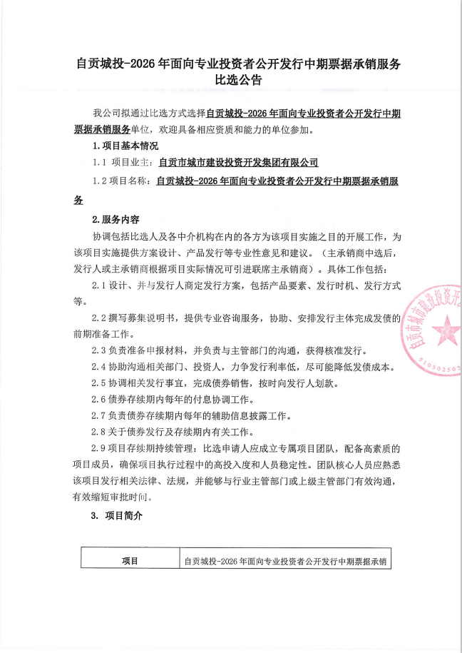 自贡城投-2026年面向专业投资者公开发行中期票据承销服务比选公告