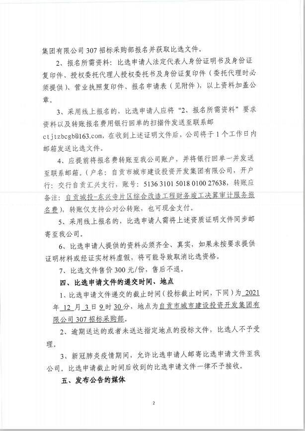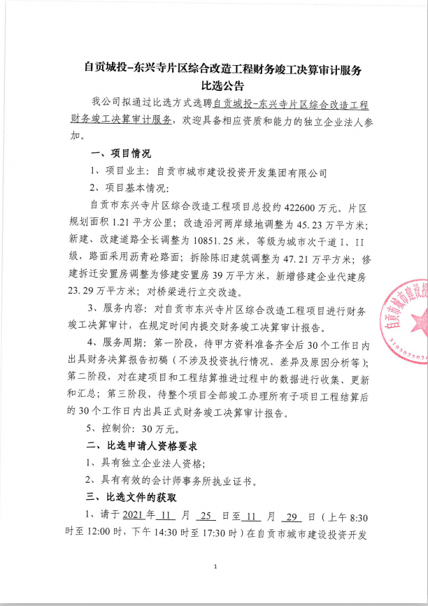 自贡城投-东兴寺片区综合改造工程财务竣工决算审计服务比选公告