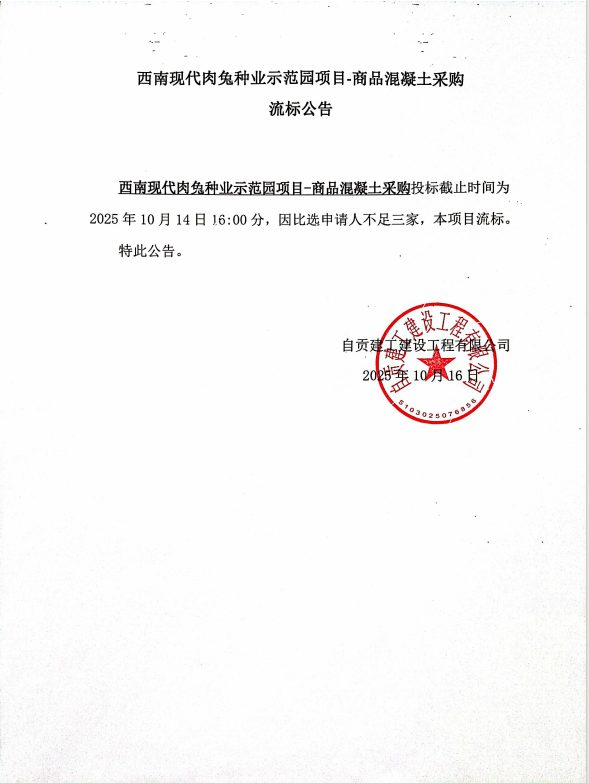 自贡市现代肉兔养殖示范基地项目-商品混凝土采购流标公告