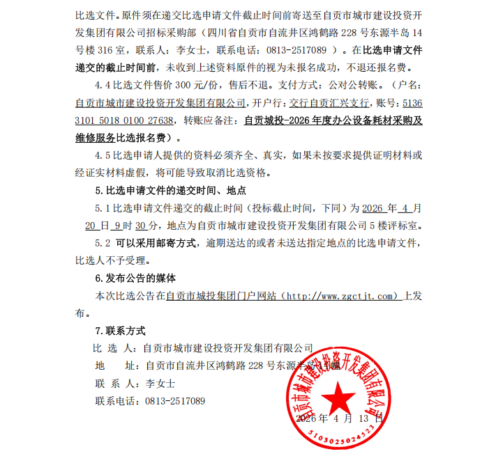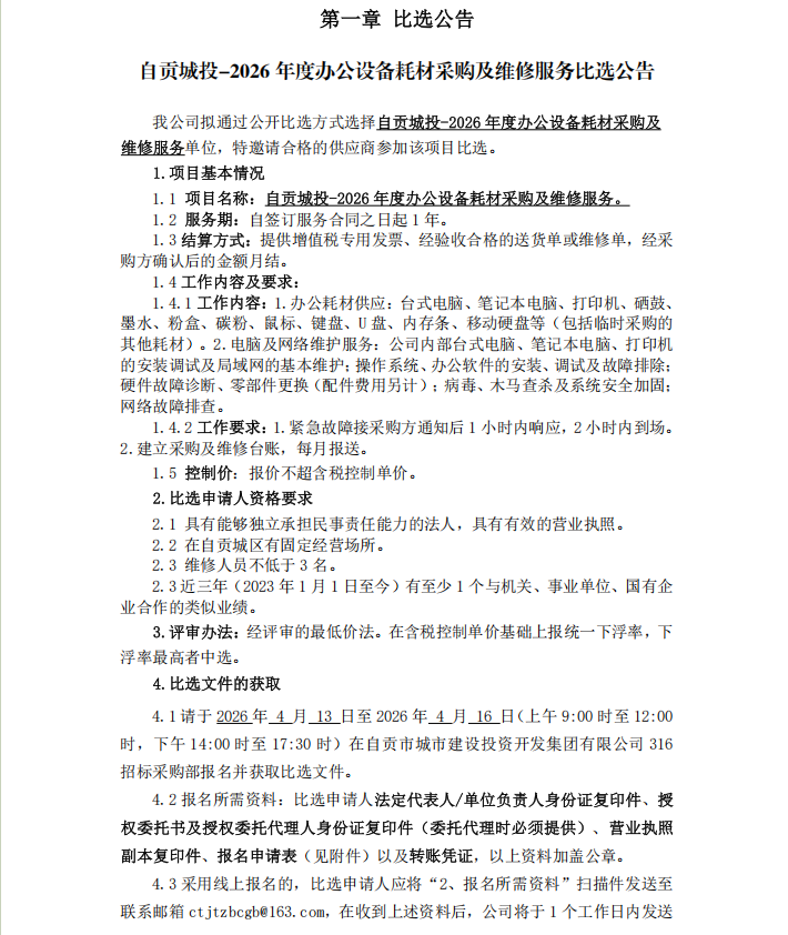 自贡城投-2026年度办公设备耗材采购及维修服务比选公告