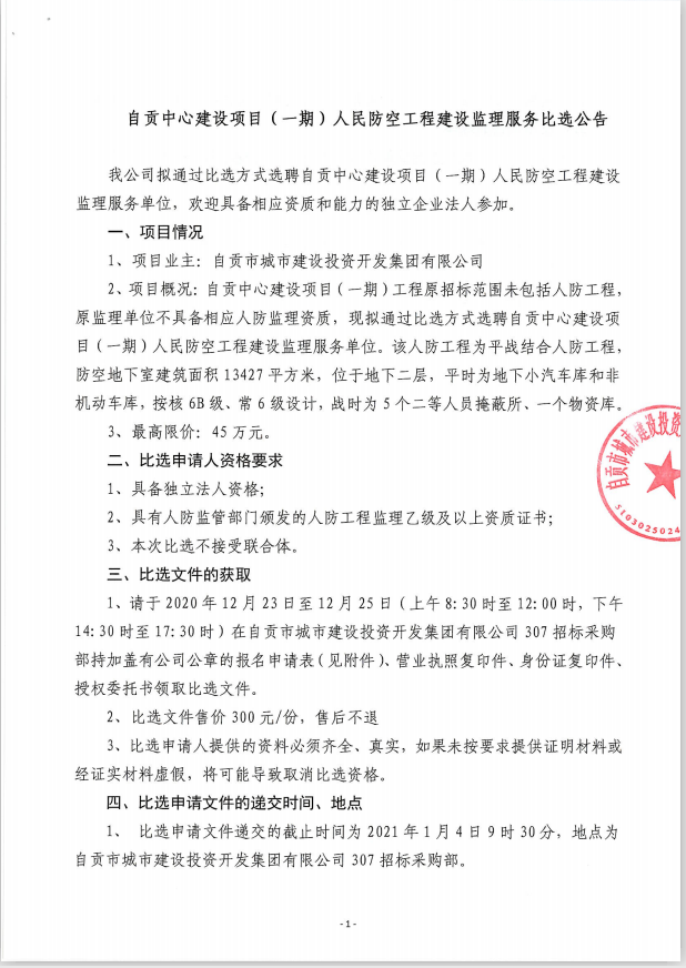 自贡中心建设项目(一期)人民防空工程建设监理服务比选公告