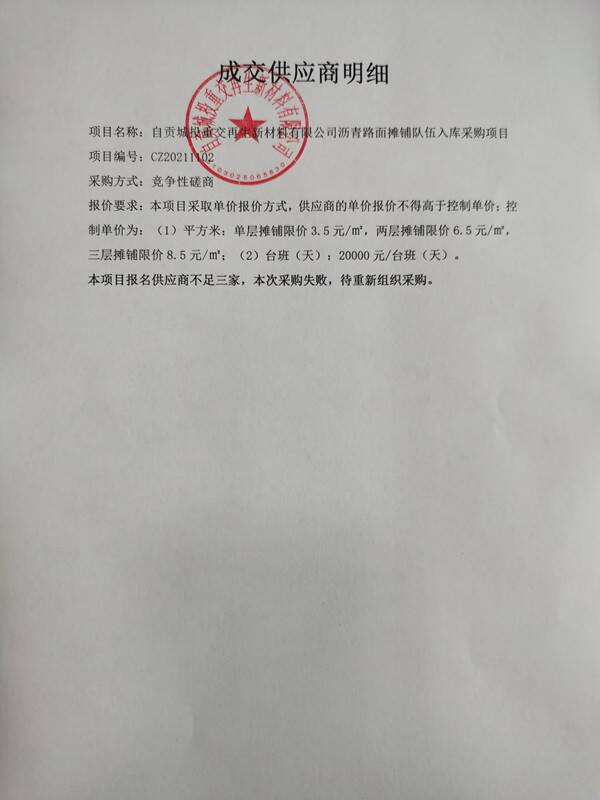 自贡城投重交再生新材料有限公司沥青路面摊铺队伍入库采购项目成交供应商明细