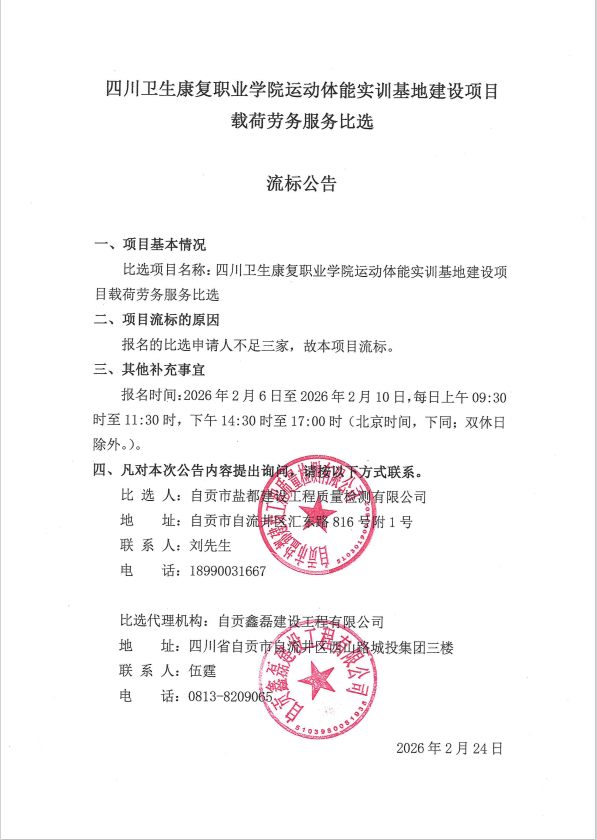 四川卫生康复职业学院运动体能实训基地建设项目载荷劳务服务比选流标公告