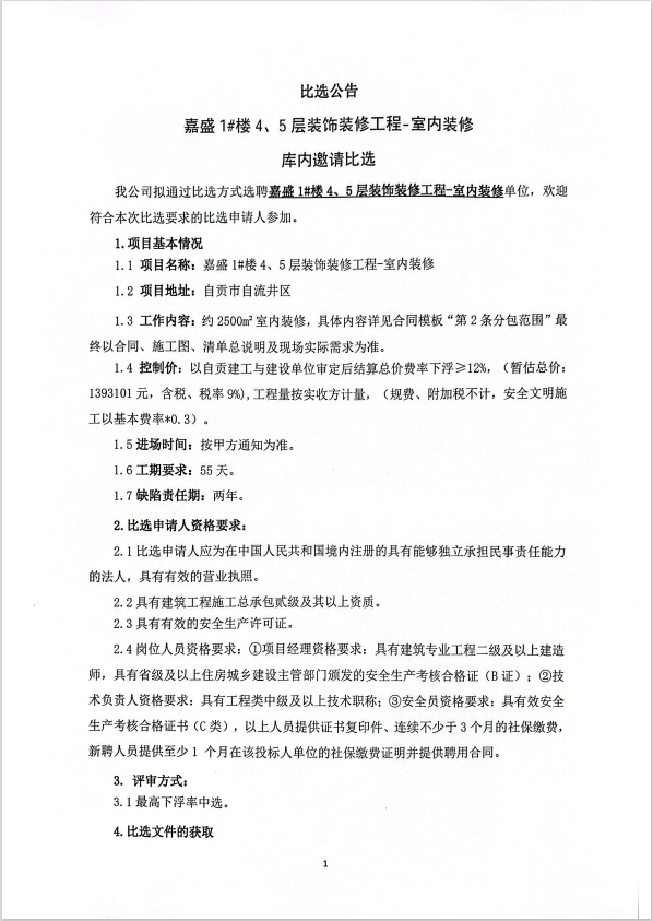 嘉盛1#4、5层装饰装修工程-室内装修库内邀请比选比选公告