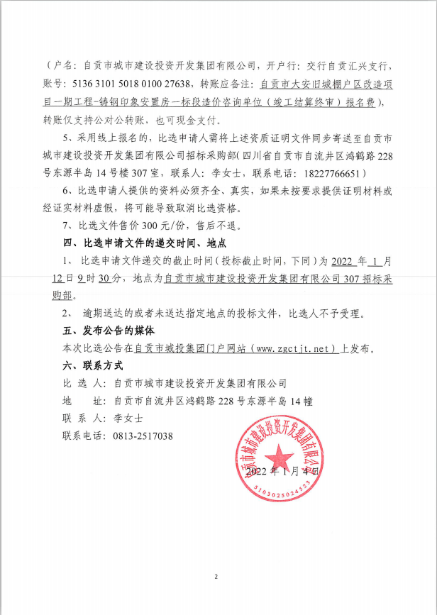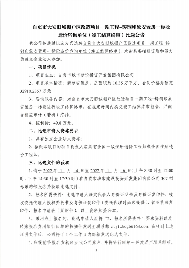 自贡市大安旧城棚户区改造项目一期工程-铸钢印象安置房一标段造价咨询单位(竣工结算终审)比选公告