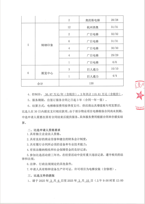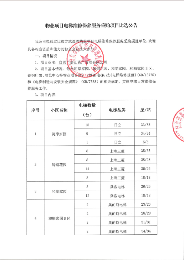 物业项目电梯维修保养服务采购项目比选公告