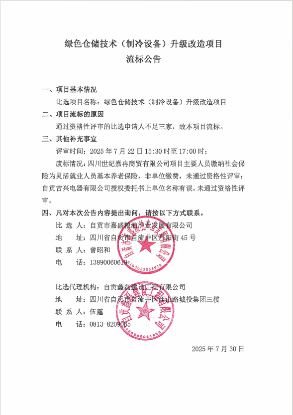 绿色仓储技术(制冷设备)升级改造项目流标公告
