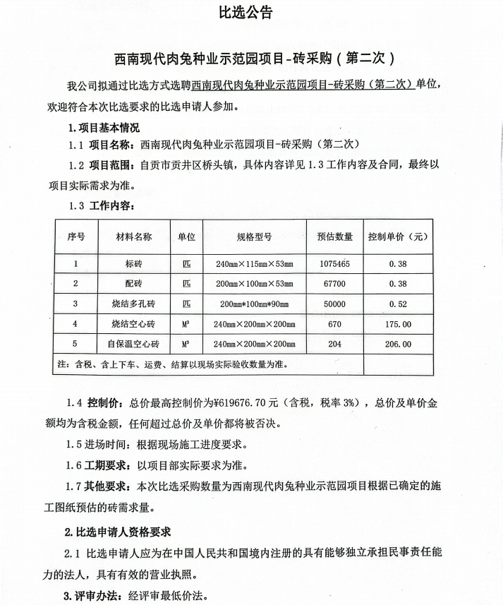 自贡市现代肉兔养殖示范基地项目-砖采购(第二次)比选公告