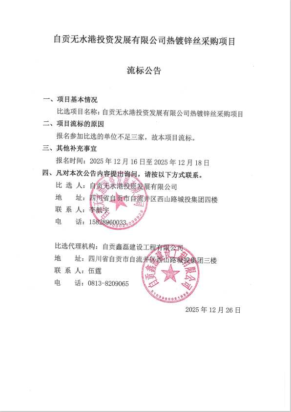 自贡无水港投资发展有限公司热镀锌丝采购项目流标公告