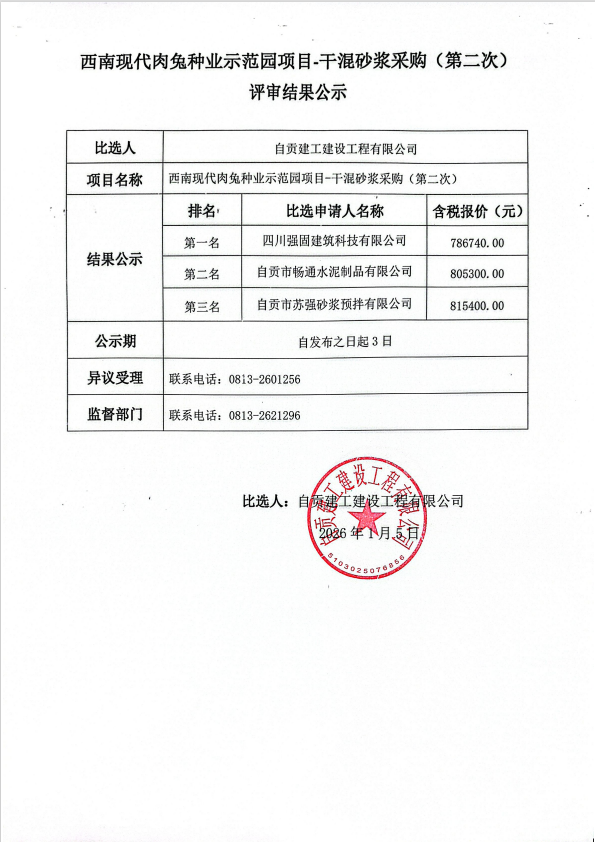 西南现代肉兔种业示范园项目-干混砂浆采购(第二次)评审结果公示