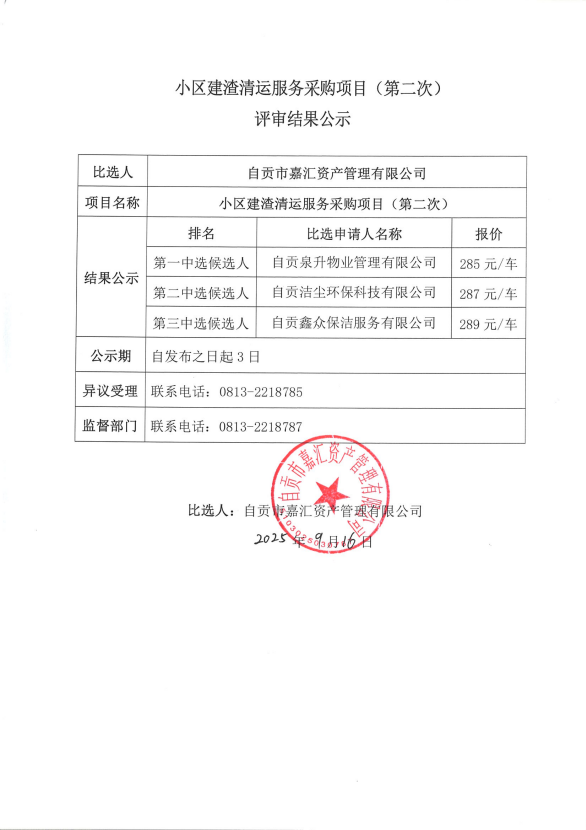 小区建渣清运服务采购项目(第二次)评审结果公示
