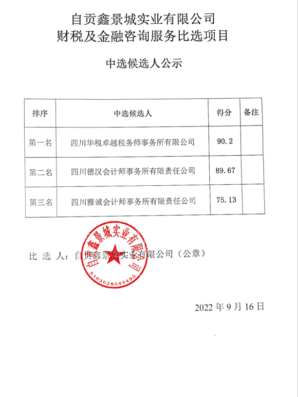 自贡鑫景城实业有限公司财税及金融咨询服务比选项目中选候选人公示