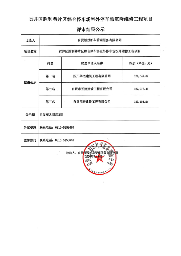 贡井胜利巷片区综合停车场室外停车场沉降维修工程项目评审结果公示