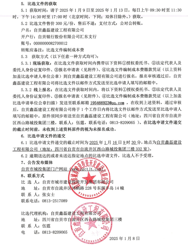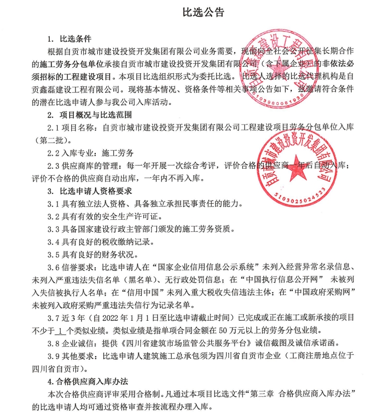 自贡市城市建设投资开发集团有限公司工程建设项目施工劳务分包单位入库(第二批) 比选公告