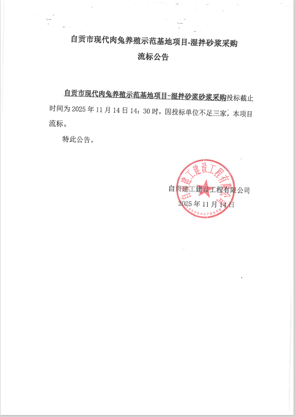 自贡市现代肉兔养殖示范基地项目-湿拌砂浆采购流标公告
