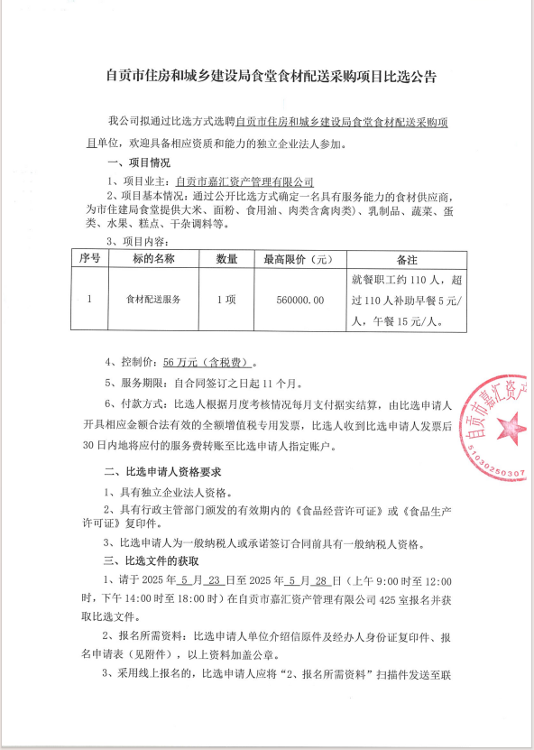自贡市住房和城乡建设局食堂食材配送采购项目比选公告