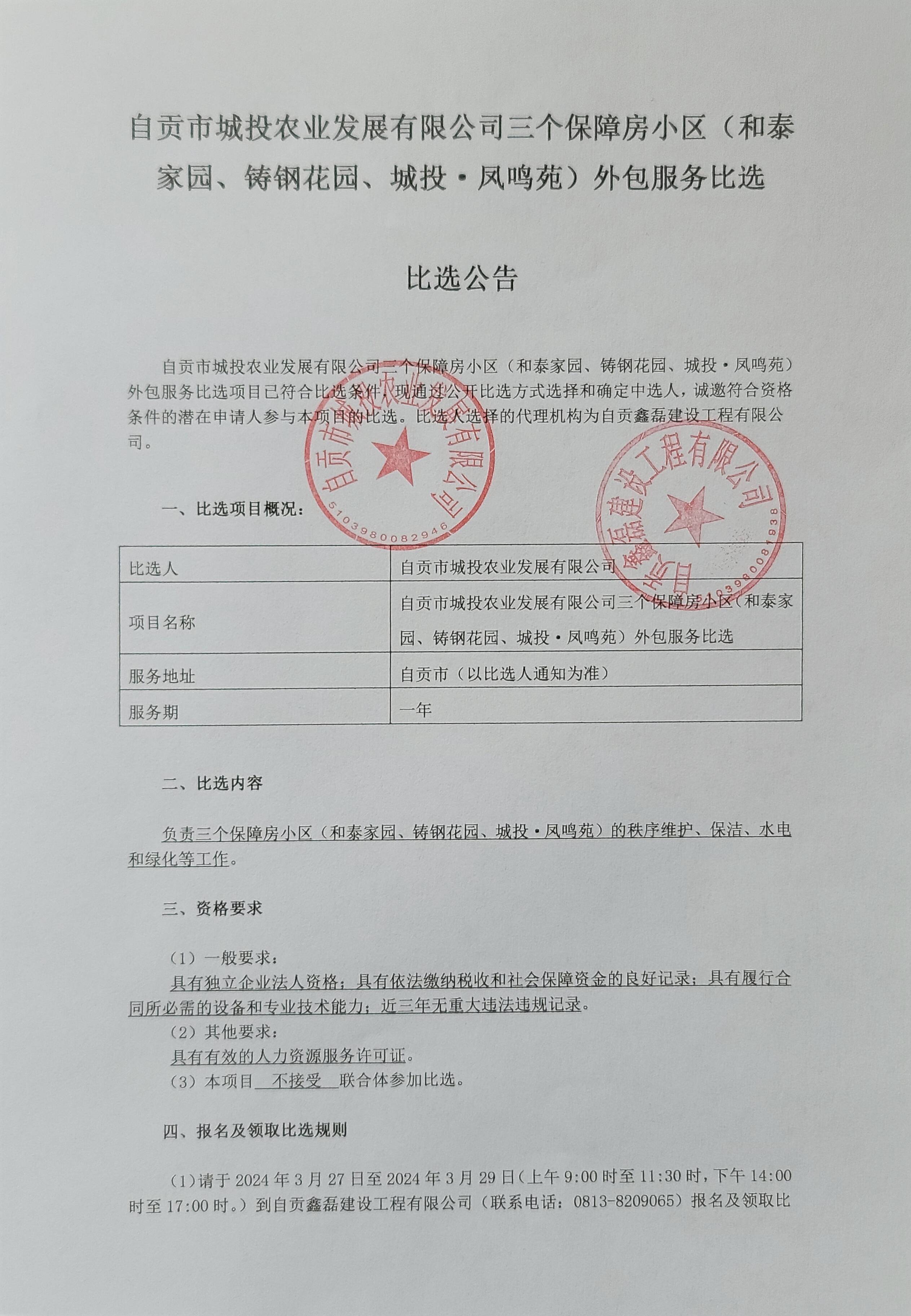 自贡市城投农业发展有限公司三个保障房小区(和泰家园、铸钢花园、城投·凤鸣苑)外包服务比选公告
