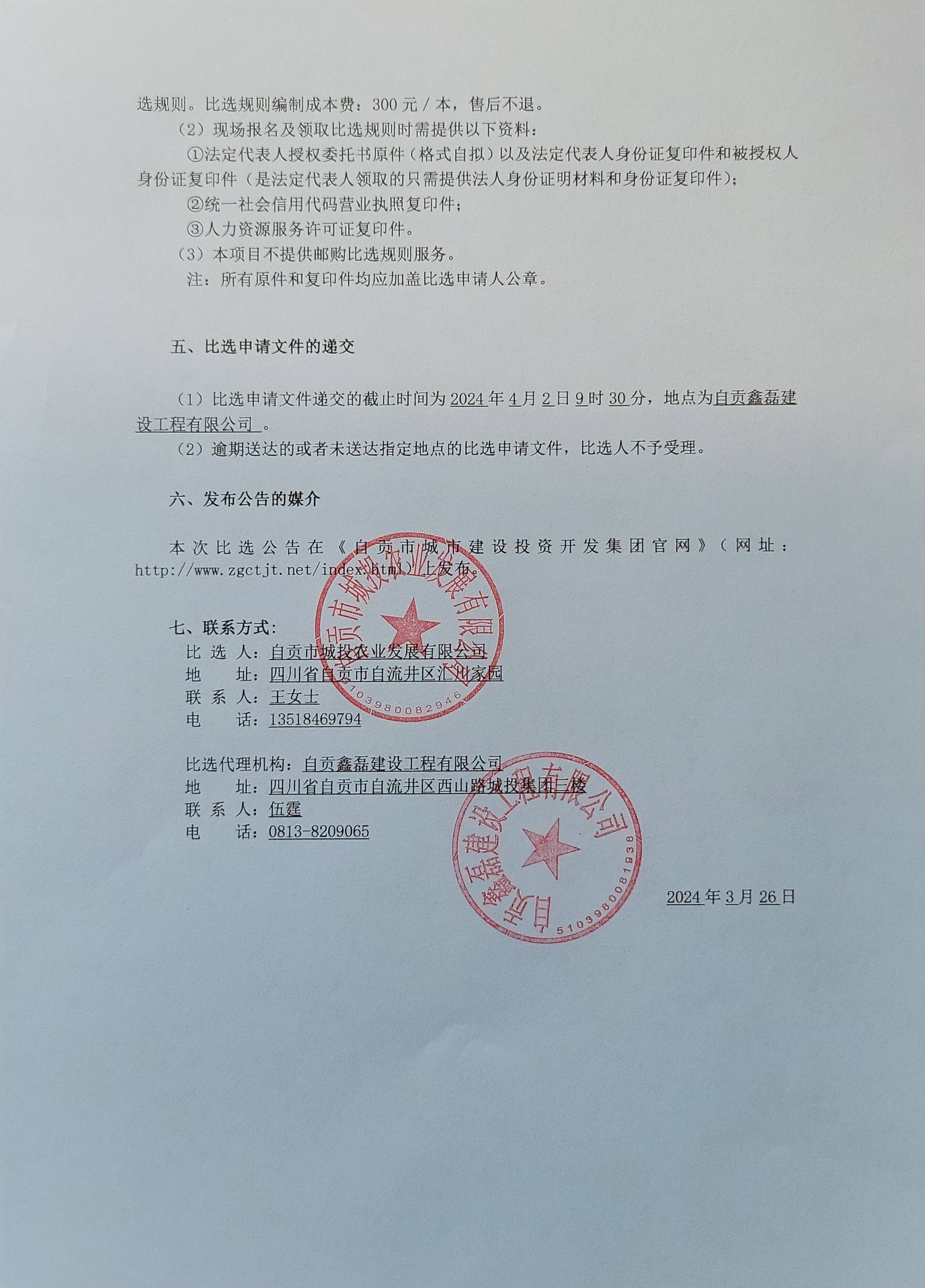 自贡市城投农业发展有限公司直管市场安保工作承包服务比选公告