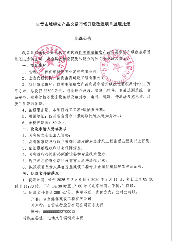 自贡市城镇农产品交易市场升级改造项目监理比选比选公告