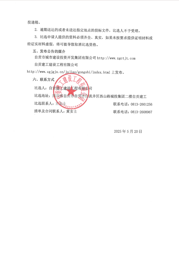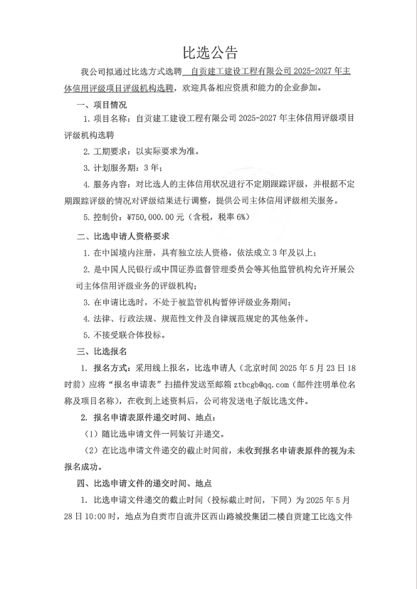自贡建工建设工程有限公司2025-2027年主体信用评级项目评级机构选聘比选公告