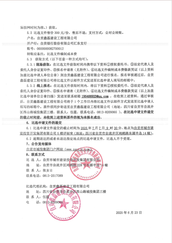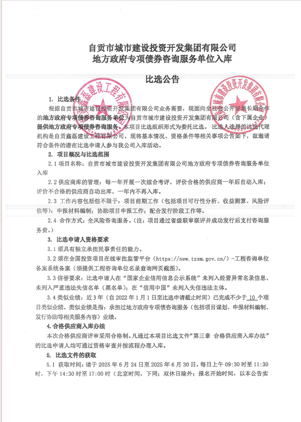 自贡市城市建设投资开发集团有限公司地方政府专项债券咨询服务单位入库比选公告