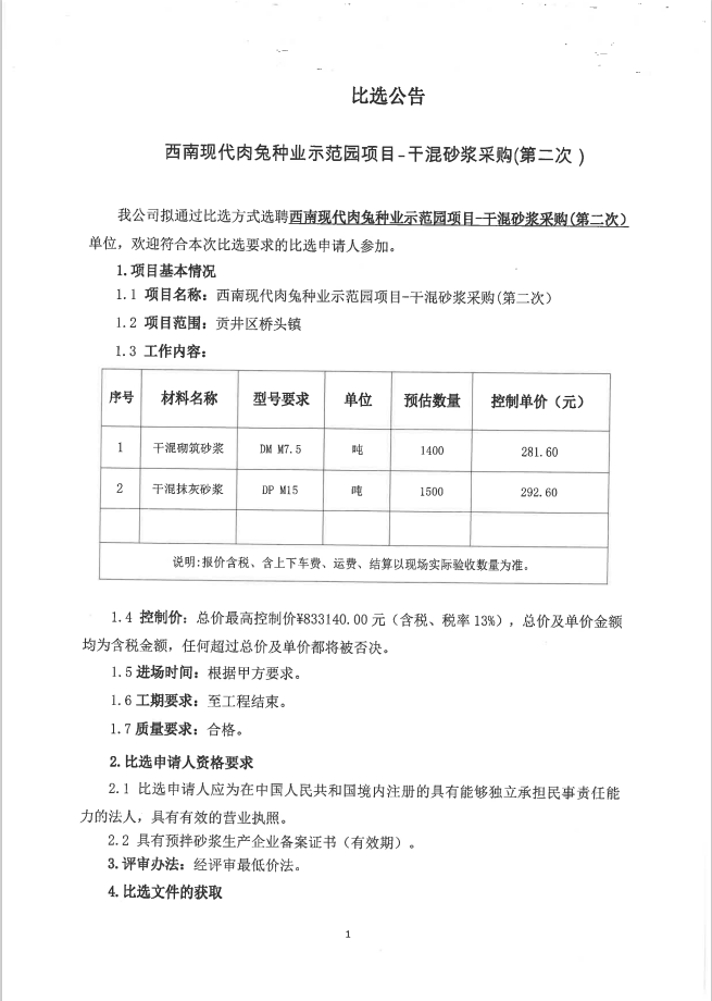 西南现代肉兔种业示范园项目-干混砂浆采购比选公告