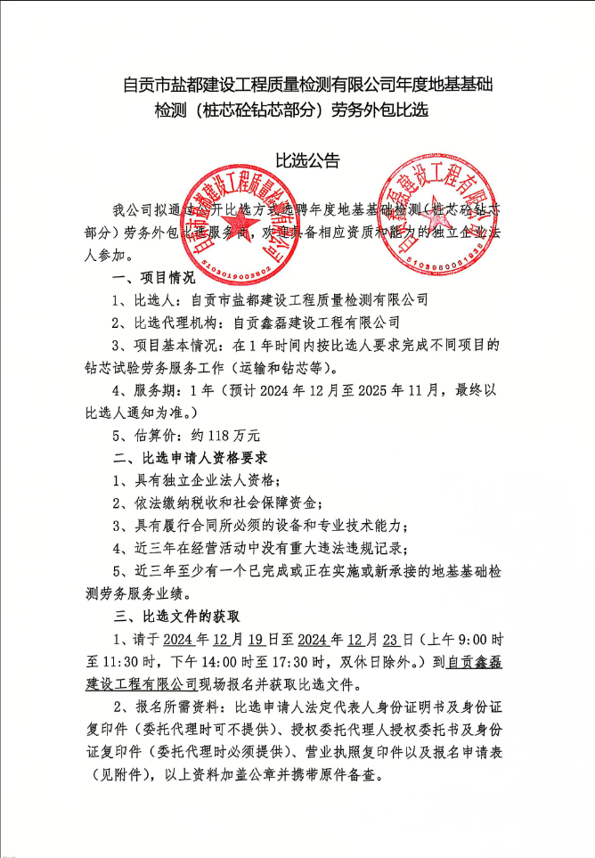 自贡市盐都建设工程质量检测有限公司年度地基基础检测(桩芯砼钻芯部分)劳务外包比选比选公告