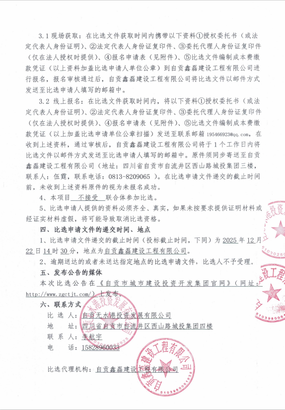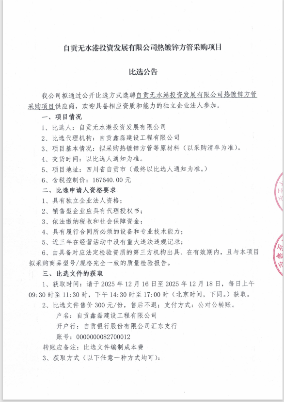 自贡无水港投资发展有限公司热镀锌方管采购项目比选公告