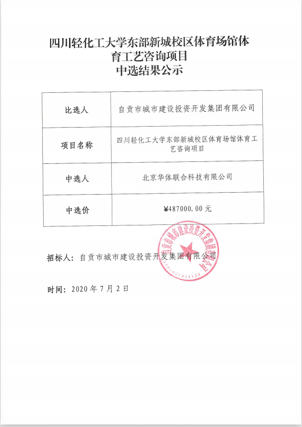 四川轻化工大学东部新城校区体育场馆体育工艺咨询项目中选结果公示