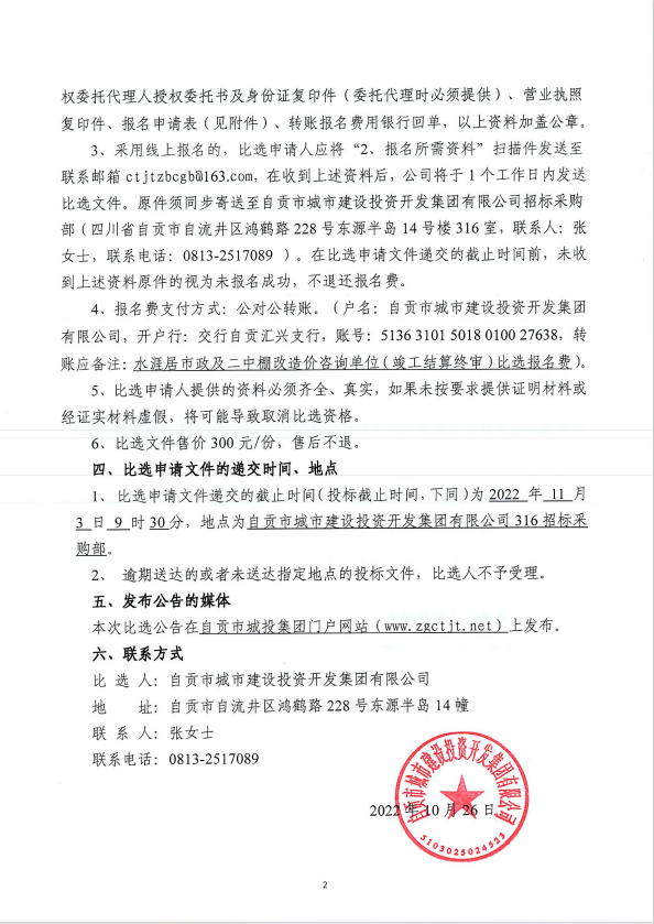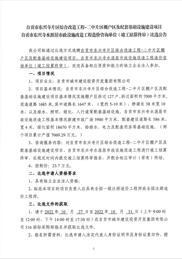 自贡市东兴寺片区综合改造工程-二中片区棚户区及配套基础设施建设项目、自贡市东兴寺水涯居市政设施改造工程造价咨询单位(竣工结算终审)比选公告