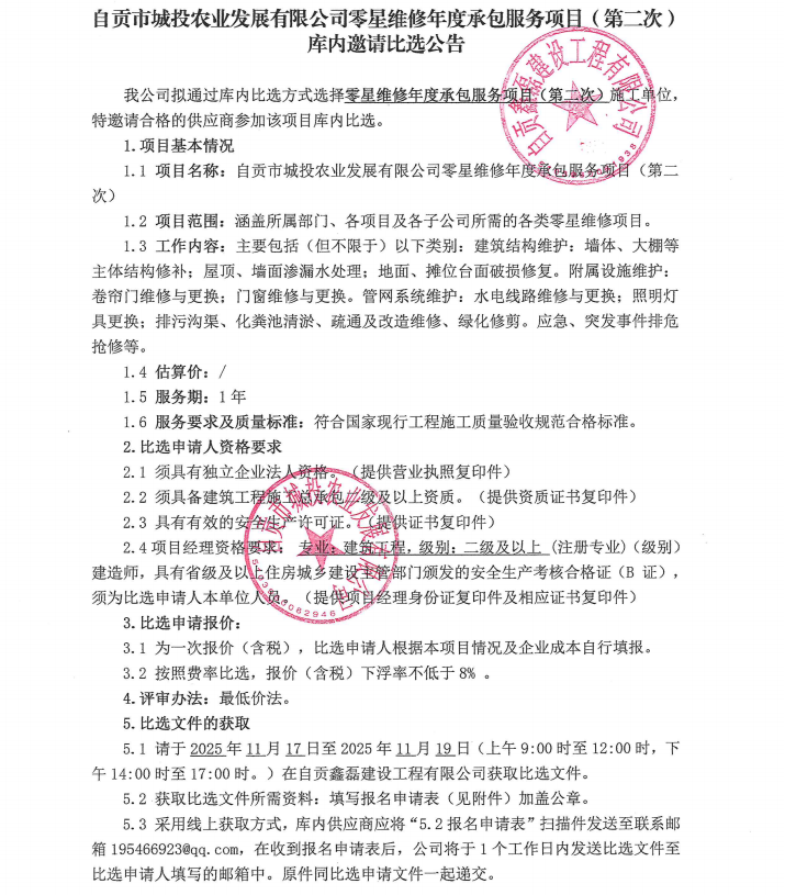 自贡市城投农业发展有限公司零星维修年度承包服务项目(第二次)库内邀请比选公告