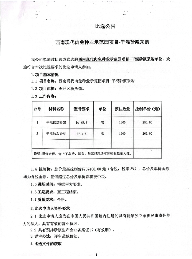 西南现代肉兔种业示范园项目-干混砂浆采购比选公告