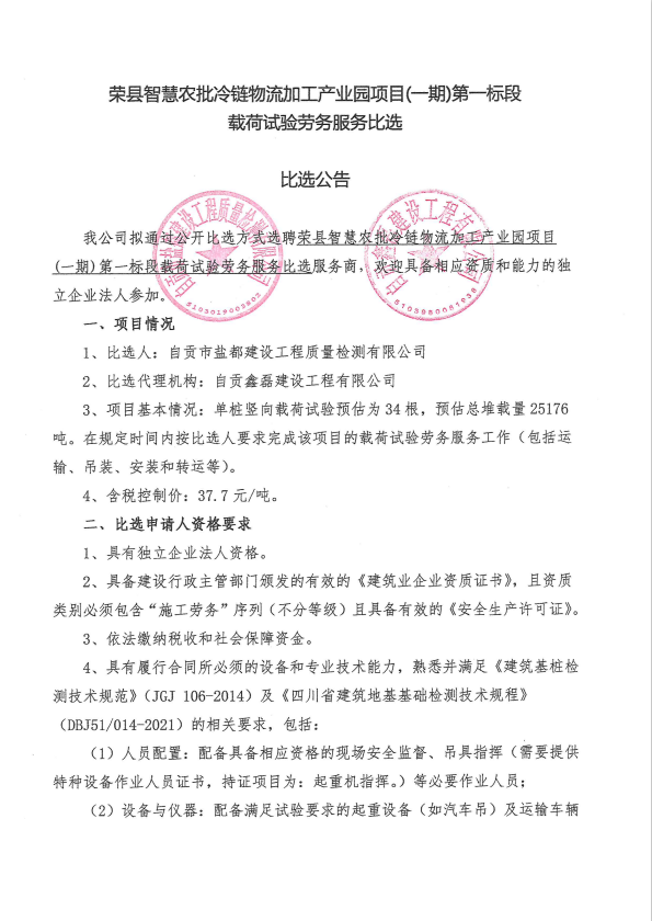 荣县智慧农批冷链物流加工产业园项目(一期)第一标段载荷试验劳务服务比选比选公告