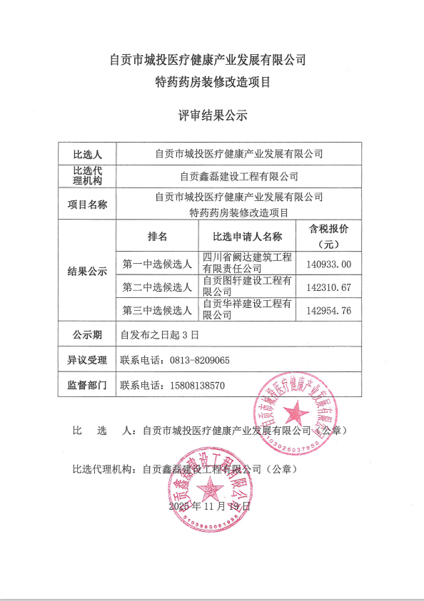 自贡市城投医疗健康产业发展有限公司特药药房装修改造项目评审结果公示
