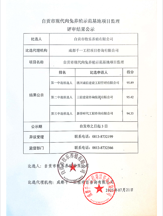 自贡市现代肉兔养殖示范基地项目监理评审结果公示