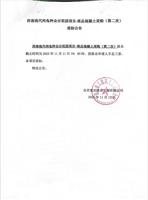 西南现代肉兔种业示范园项目-商品混凝土采购(第二次)流标公告