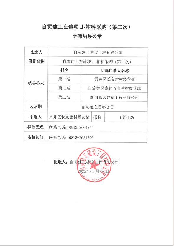 自贡建工在建项目-辅料采购(第二次)评审结果公示