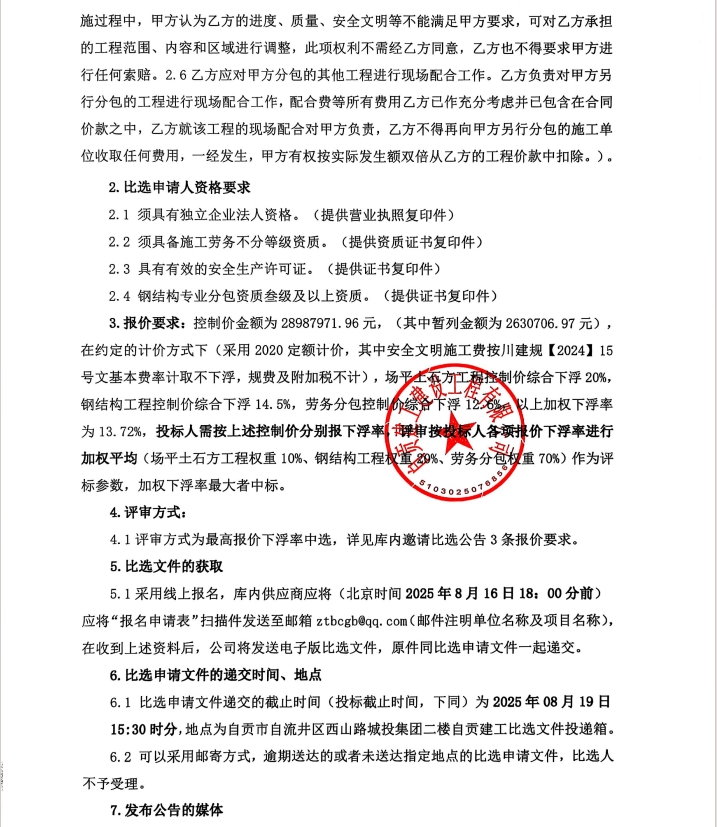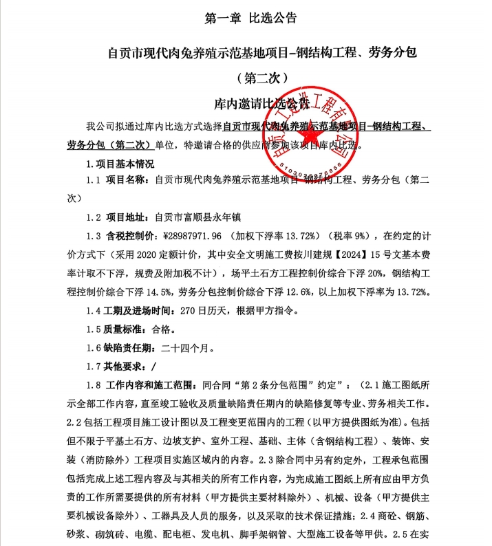 自贡市现代肉兔养殖示范基地项目-钢结构工程、劳务分包(第二次)库内邀请比选公告