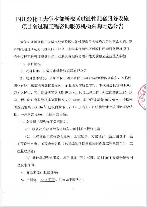 四川轻化工大学本部新校区过渡性配套服务设施项目全过程工程咨询服务机构采购比选公告